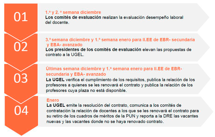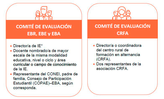 El proceso está a cargo de los comités de evaluación que se conforman en las IE. En el caso de las IE unidocentes, PRONOEI y profesores contratados con encargatura de dirección, la evaluación la realiza el jefe de Gestión Pedagógica o especialista de educación de la UGEL.