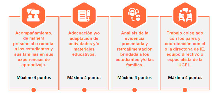 La evaluación se realiza mediante una ficha de evaluación del desempeño laboral que valora cuatro factores y once aspectos, los cuales recogen diversos aspectos de las actividades que ha realizado el docente. Se consideran como evidencia, los informes mensuales realizados sobre trabajo remoto (Formato 1 del Oficio Múltiple 00049-2020-MINEDU/VMGP-DIGEDD-DITEN) que el docente presentó a su director o coordinador.